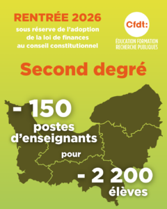Dans le second degré, la taille à la hache continue, avec -150 postes pour – 2200 élèves (contre -137 pour -1800 l’an dernier), et la perte d’1 emploi de CPE.