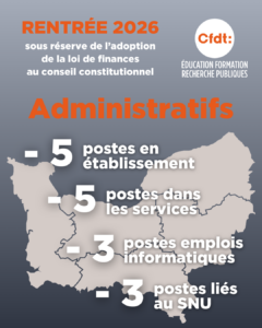 Les personnels administratifs ne sont pas épargnés par ces coupes à tout va, puisque 5 suppressions de postes dans les établissements sont annoncées, et que les services académiques devront rendre 11 postes en tout (il est déjà loin le temps où le ministère s’engageait à une attention particulière à notre académie fusionnée, forcée de travailler sur deux sites rectoraux).