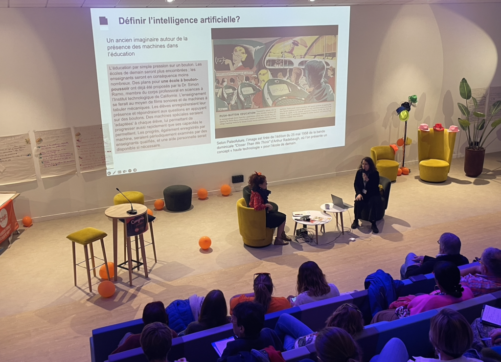 Le vendredi matin, Cristina Popescu, enseignante à l’université de Bielefeld (Allemagne) et membre du Cercle de Recherche et d’Action Pédagogique, nous a fait une présentation captivante sur les enjeux autour de l’intelligence artificielle, en particulier pour nos métiers et nos élèves, qui a donné lieu à de passionnants échanges.